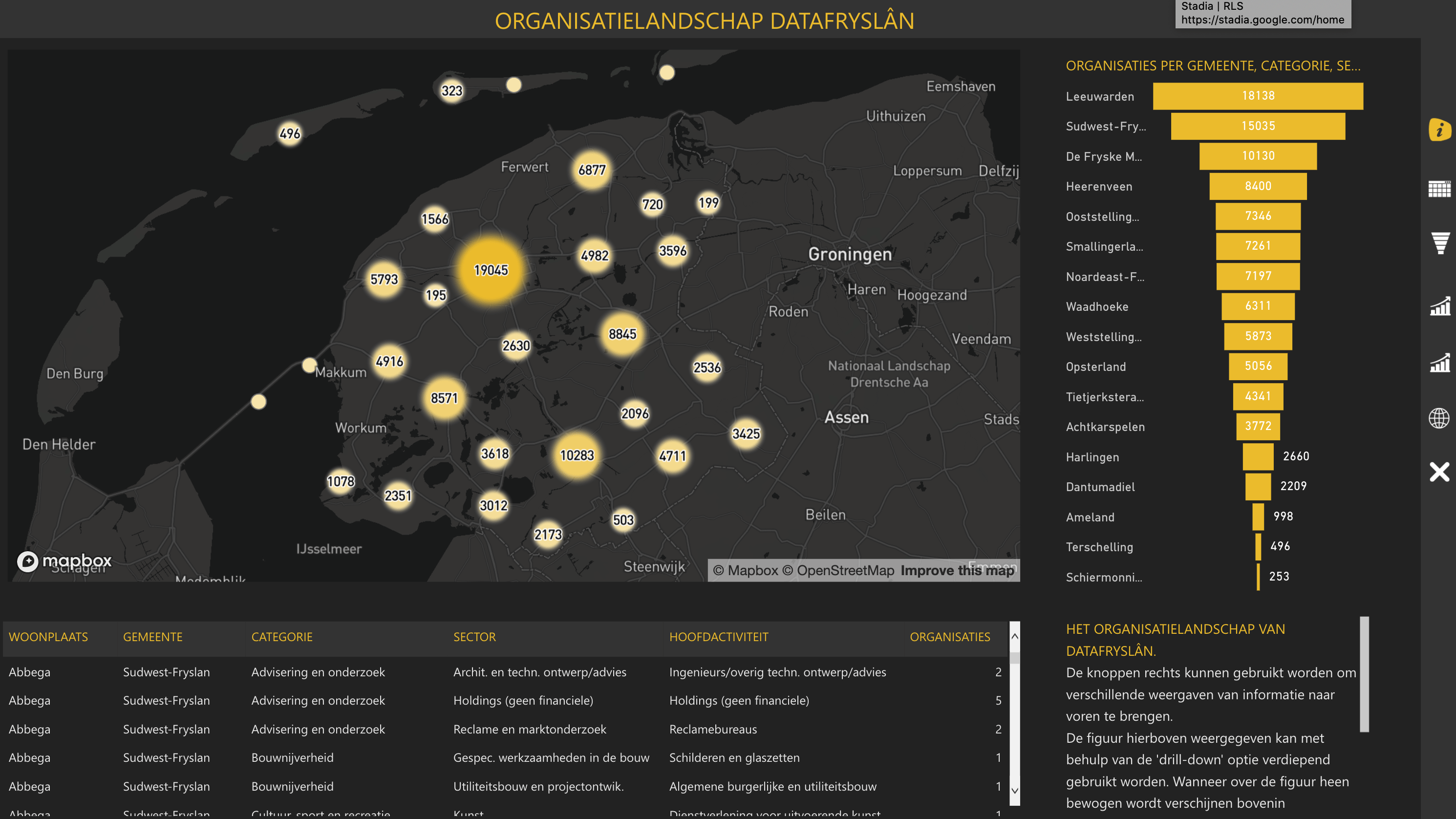 Hoeveel organisaties zijn er actief in Friesland? Wat zijn hun hoofdactiviteiten? De open data van de Kamer van Koophandel wordt op een geografische manier gepresenteerd door dit dashboard en is makkelijk te doorzoeken en te filteren. Dit dashboard is gebouwd als onderdeel van het programma /HUB Datalandschap.